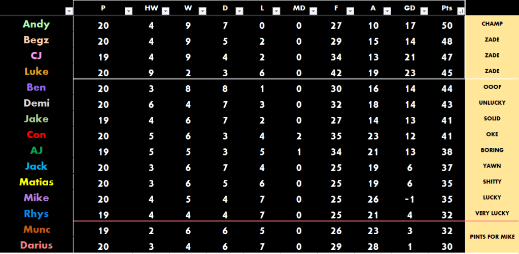 January 28, 2021May 16, 2022MikeFranchettiLeave a Comment on PLS5 #GW20 – Halfway PLS Crooks! PLS5 #GW20 – Halfway PLS Crooks! Mike loses on Liverpool AND United to end Part 1. Buying himself a pint? Meanwhile, CJ vs. Begley vs. Andy? Share this: Click to share on X (Opens in new window) X Click to share on Facebook (Opens in new window) Facebook Like Loading... Related