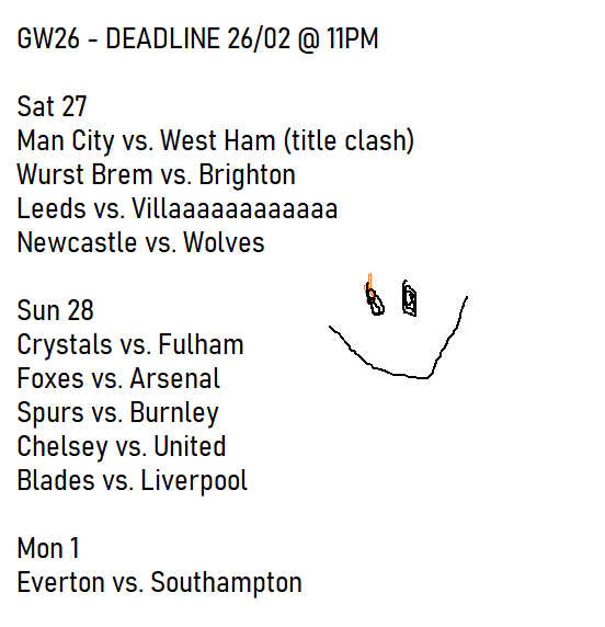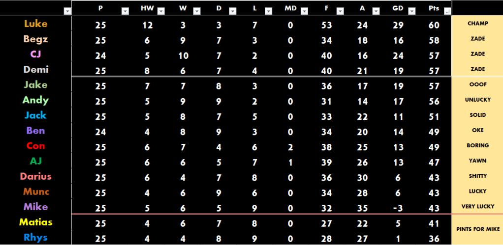 February 22, 2021May 16, 2022MikeFranchettiLeave a Comment on PLS5 #GW25 – Luke’s Second Spike PLS5 #GW25 – Luke’s Second Spike Luke wins, Mike wins! Mat back in the pint pot! IMPORTANT FIXTURE STUFF AND EVEN MORE IMPORTANT FIXTURE STUFF Share this: Click to share on X (Opens in new window) X Click to share on Facebook (Opens in new window) Facebook Like Loading... Related