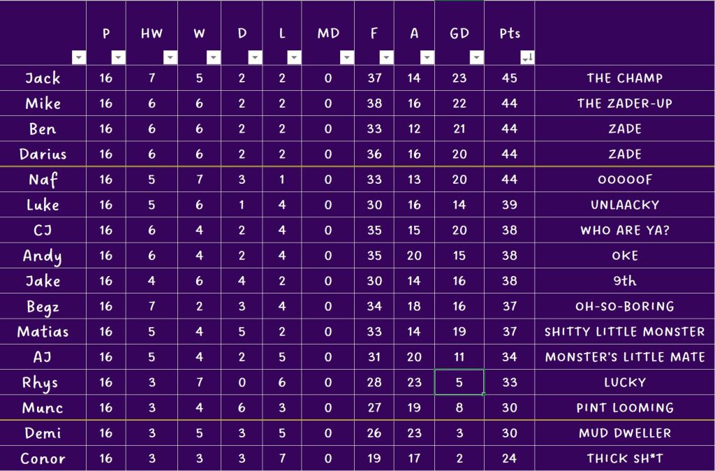 December 11, 2023MikeFranchettiLeave a Comment on #PLS8 #GW16 – The Worst Collective Performance EVER??? #PLS8 #GW16 – The Worst Collective Performance EVER??? Jack fully mudded but stays top, West Ham get wanged… and so do Goa! Only three wins! No Shandies! Share this: Click to share on X (Opens in new window) X Click to share on Facebook (Opens in new window) Facebook Like Loading... Related